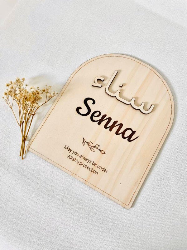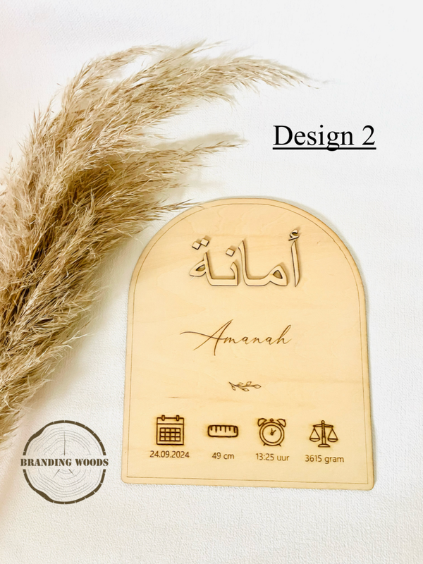 Dit boogvormige geboortebord met 3D Arabische naam is een unieke en stijlvolle manier om de geboorte van je kleintje te vieren. Gemaakt van hoogwaardige materialen, het bord heeft een elegante boogvorm die een verfijnde uitstraling geeft. De 3D Arabische naam is zorgvuldig uitgelaserd en bevestigd op het bord, wat zorgt voor een prachtig diepte-effect. Ideaal om te plaatsen in de babykamer als blijvende herinnering. Personaliseer het met de naam van je baby en creëer een betekenisvol en bijzonder aandenken voor dit speciale moment.