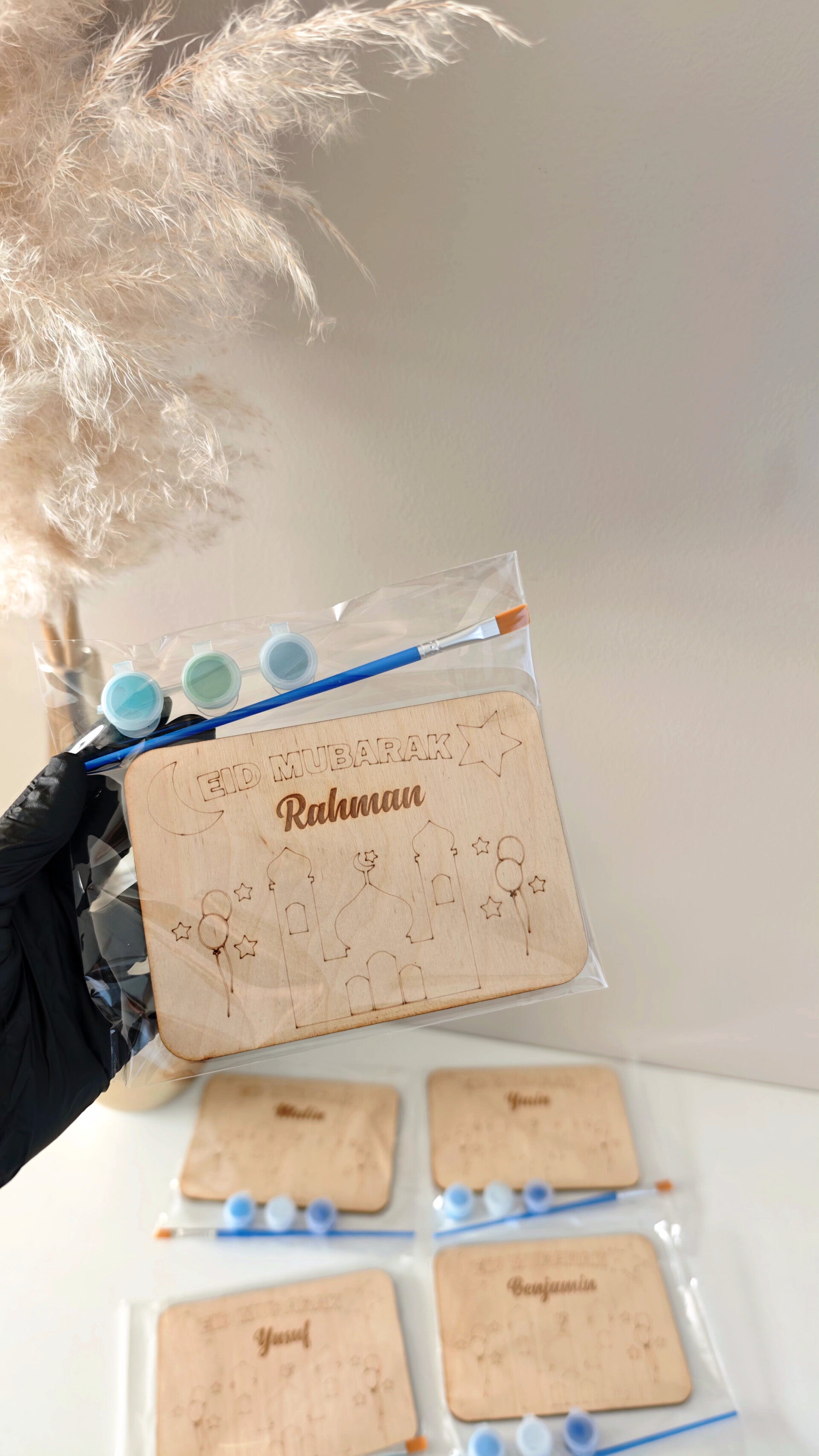 Ontdek het perfecte geschenk voor kinderen tijdens eid: ons gepersonaliseerde houten verfsetje! Elk setje wordt met zorg gegraveerd met de naam van het kind, waardoor het een uniek en speciaal cadeau wordt. Compleet met een verfkwast en drie kleurrijke verfbakjes, biedt dit setje eindeloze creatieve mogelijkheden voor je kleintjes tijdens de feestdag. Laat hun verbeelding bloeien terwijl ze zich bezighouden met het maken van kunstwerken die zowel plezierig als leerzaam zijn.