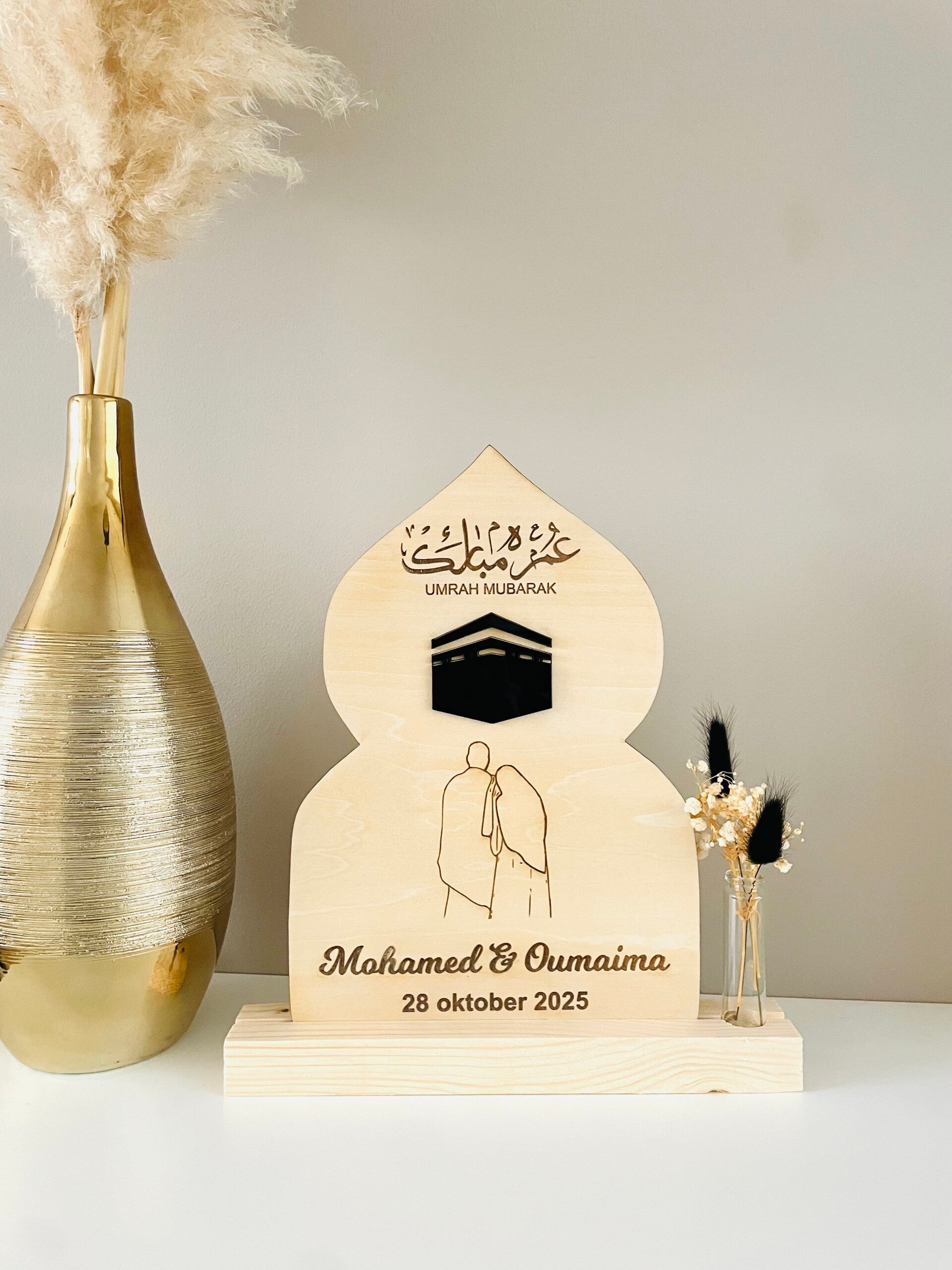 Verras uw naasten met een gepersonaliseerde tekst op een houten bord wanneer zij terugkeren van hun prachtige reis naar Mekka.