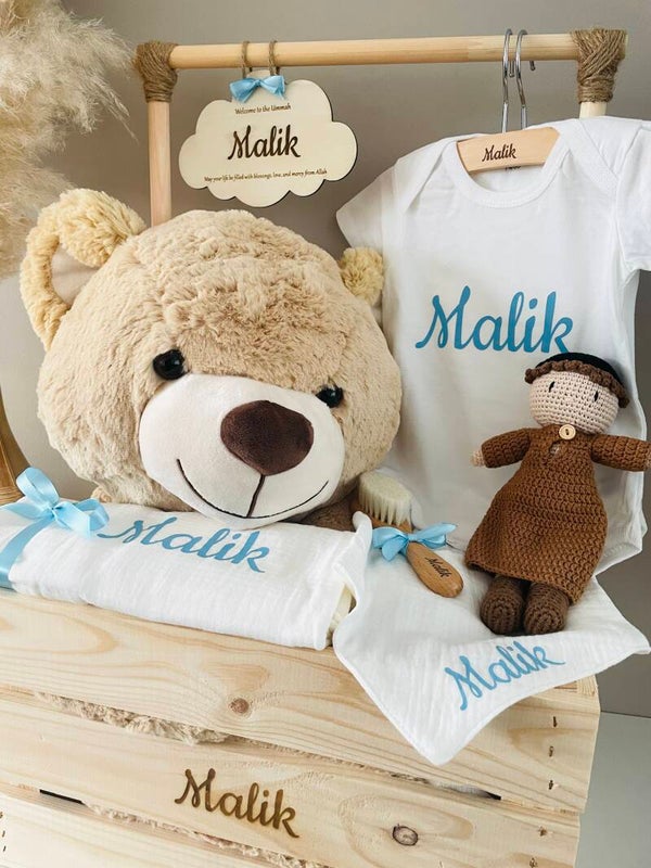 - Gepersonaliseerde babydeken (roze deken bij meisjes pakket, witte deken bij jongens pakket