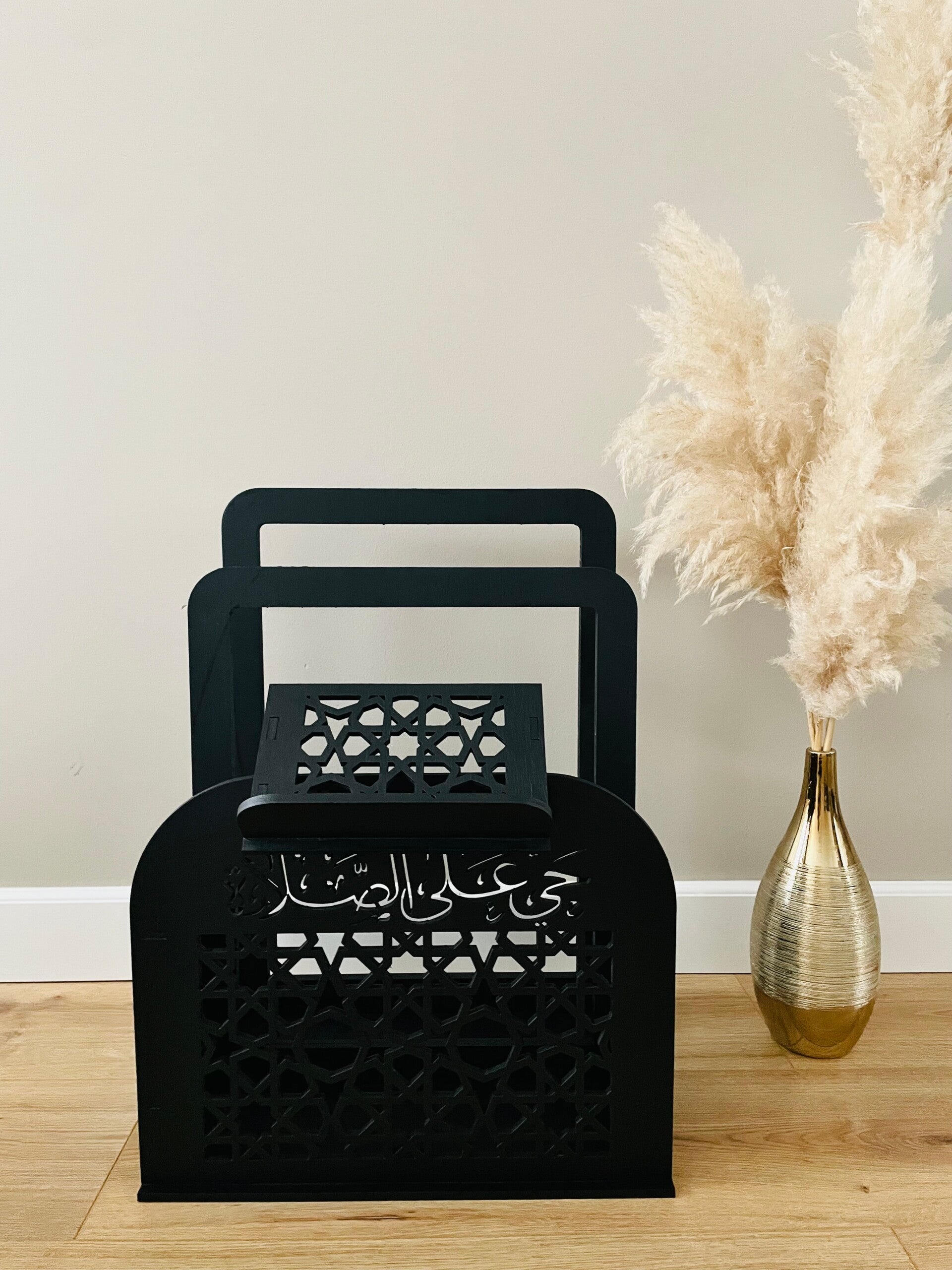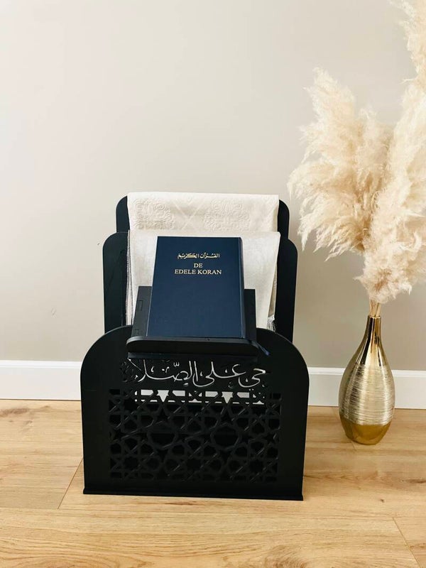 De standaard heeft een elegant uitgesneden geometrisch patroon en bevat Arabische kalligrafie met de tekst **"حي على الصلاة"** ("Haaya 'ala as-Salah" – "Kom tot het gebed"). Bovenop is een houten boekhouder (rehal) geplaatst, ideaal voor het ondersteunen van de Koran of andere religieuze boeken. Daarnaast biedt de standaard ruimte om een gebedskleed netjes op te hangen.