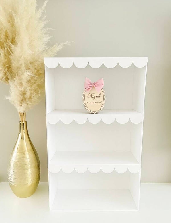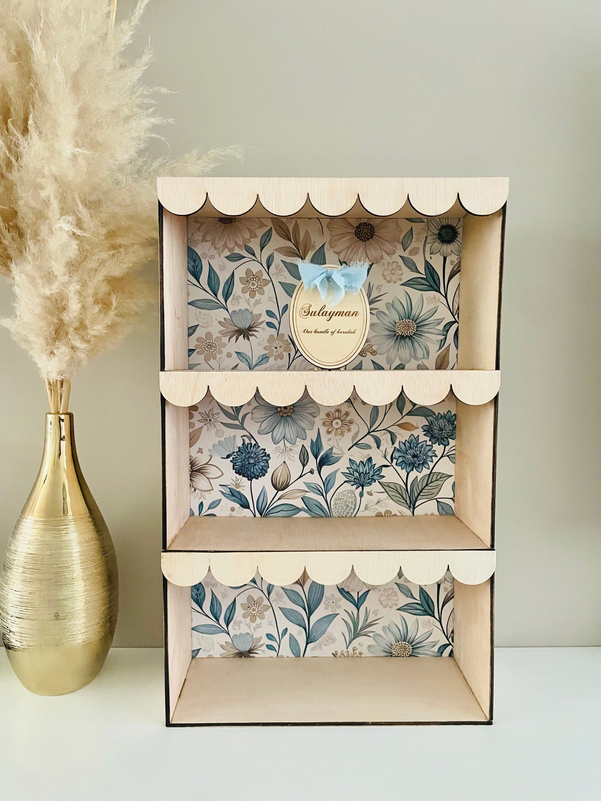 De Geboortekast is een lief en stijlvol kastje waarmee je alle geboortespulletjes mooi kunt presenteren. Met drie houten plankjes, speelse golfrandjes en een zachte bloemenprint heeft dit kastje een warme, rustgevende uitstraling.