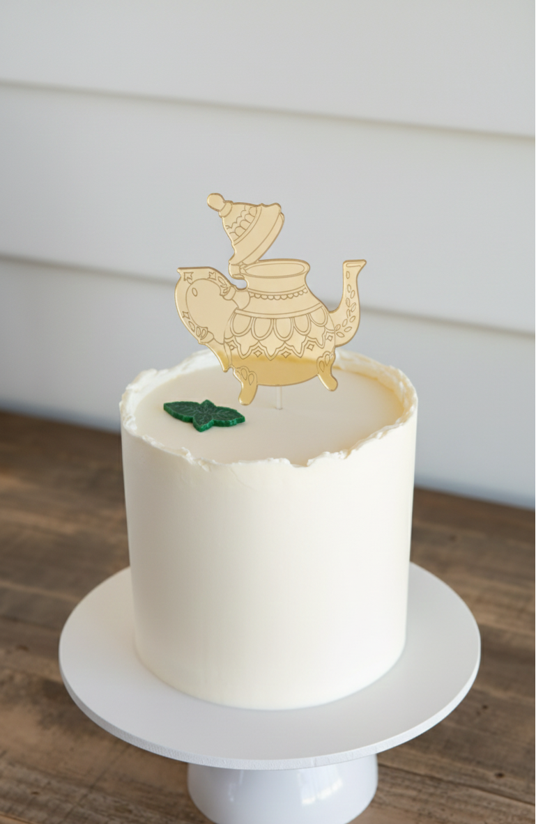 Geef je taart een elegante en culturele touch met deze unieke, goudkleurige acryl cake topper. Dit ontwerp, geïnspireerd op de traditionele Marokkaanse theecultuur, bestaat uit een prachtig gedetailleerde theepot en een los bijbehorend muntblaasje.