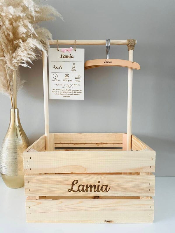 De gepersonaliseerde geboortehanger bestaat uit een kist met een hanger inclusief 2 kledinghangers en een A5 bordje. Dit wordt compleet aangeleverd.
