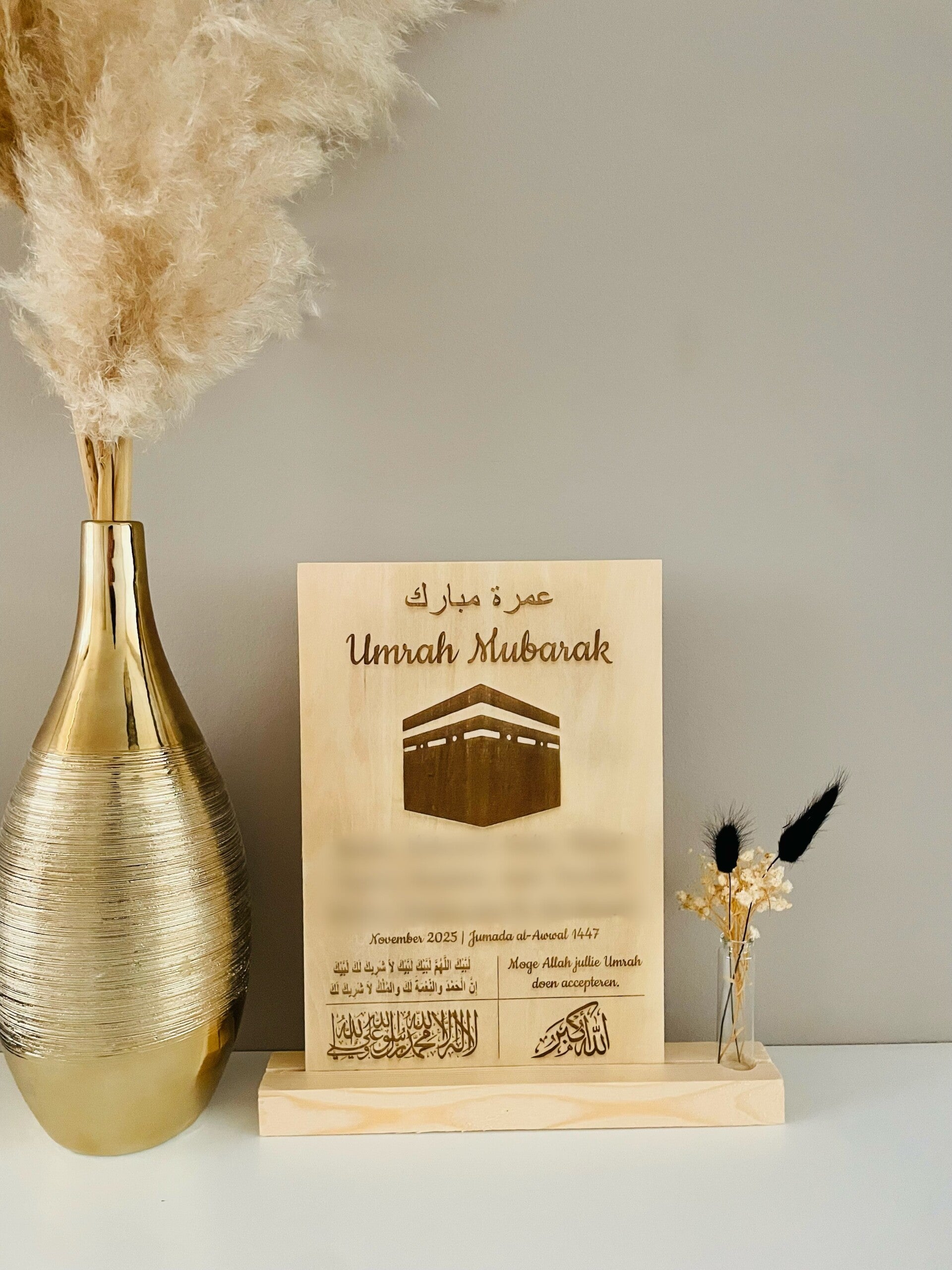 Verras uw naasten met een gepersonaliseerde tekst op een houten bord wanneer zij terugkeren van hun prachtige reis naar Mekka.